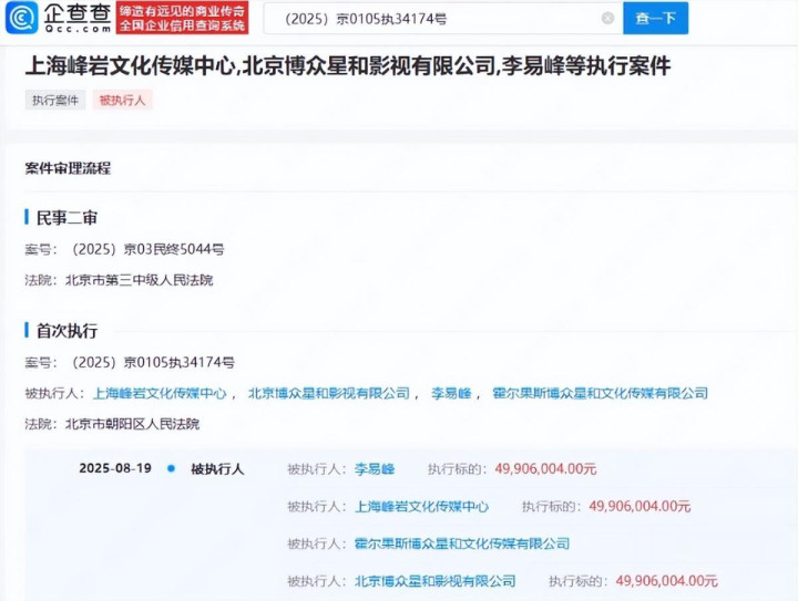 2025年的公开信息自大,李易峰过头相干公司被法院强制延迟了约4990万元的巨款。