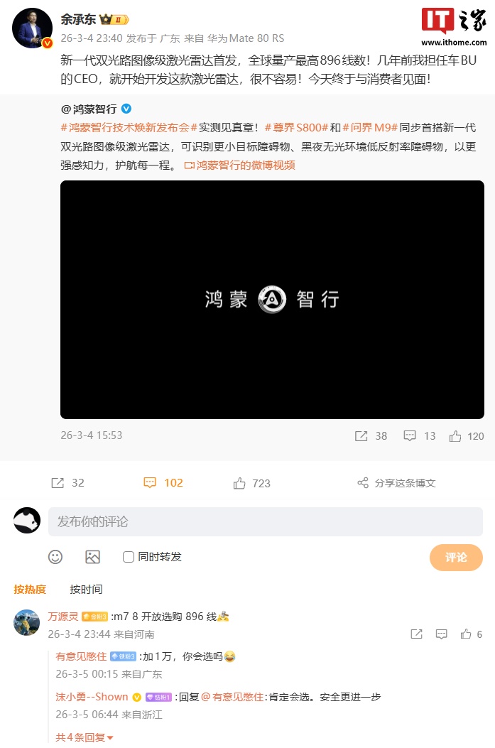 IT之家 3 月 5 日音讯,在昨天的鸿蒙智行期间焕新发布会上,华为智能汽车料理决议 BU CEO 靳玉志施展发布了群众量产最高的 896 线激光雷达 —— 新一代双光路图像级激光雷达。